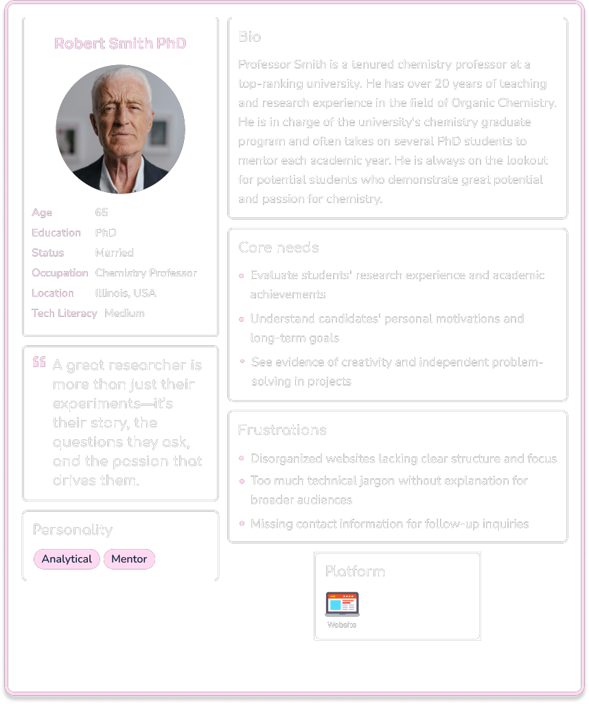 I conducted interviews with academic reviewers and admissions staff to understand what makes a student research portfolio effective, easy to navigate, and visually compelling. Their insights helped refine the site’s structure, tone, and content presentation.
