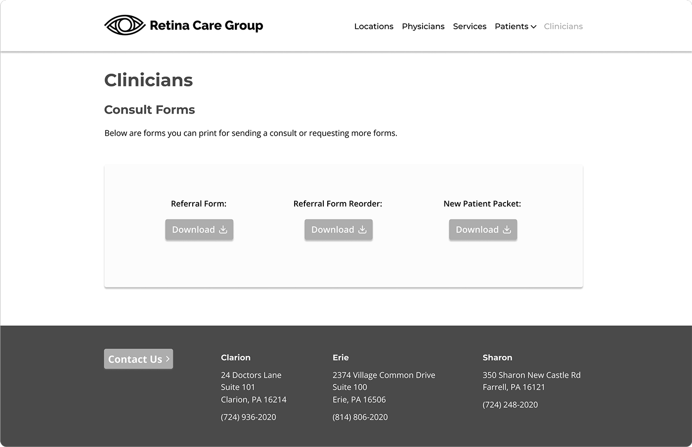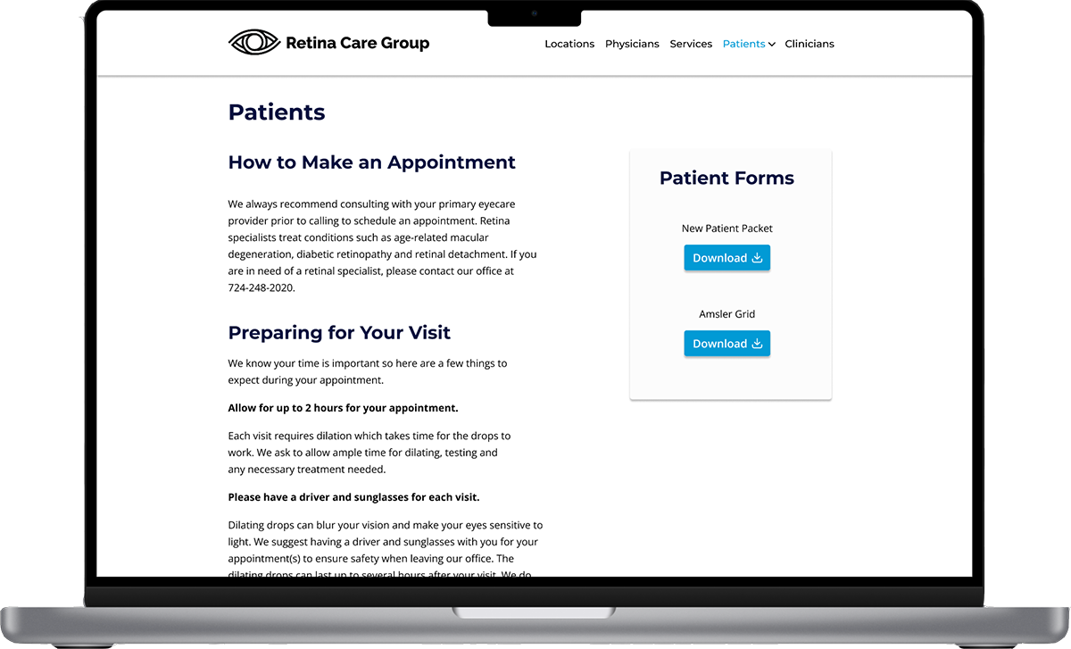 Joan is a new patient referred to Retina Care Group. She wants to download and fill out the required forms before her first appointment.