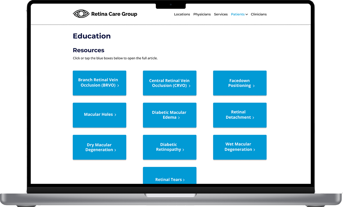 Retina Care Group’s original website was a basic template made when the practice was first founded, and it hadn’t been updated since. Patients often had trouble finding essential information or completing forms—especially older adults and those with cognitive challenges. I saw an opportunity to redesign their digital presence and make their care more approachable and accessible.
