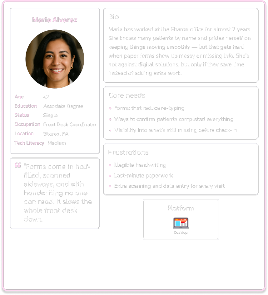 I conducted interviews with patients from Retina Care Group to understand their digital behaviors, device preferences, and overall comfort navigating medical websites and forms. These insights helped identify accessibility barriers and informed design decisions for the updated patient experience.